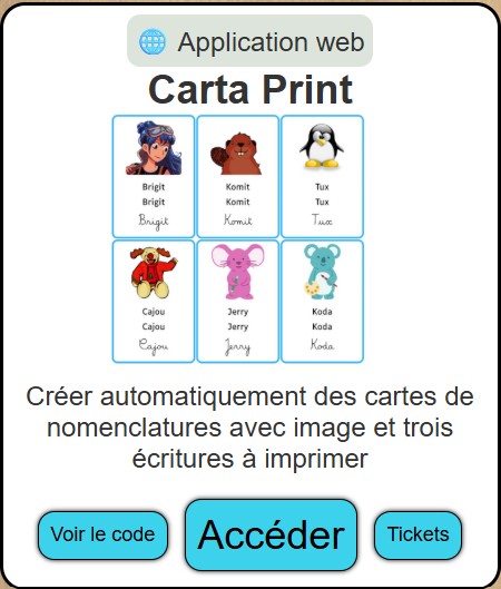 Sur Éducajou, retrouvez Cartaprint : une application en ligne pour réaliser / retrouver des vignettes de vocabulaire, qui associent une image et sa légende en plusieurs écritures.
